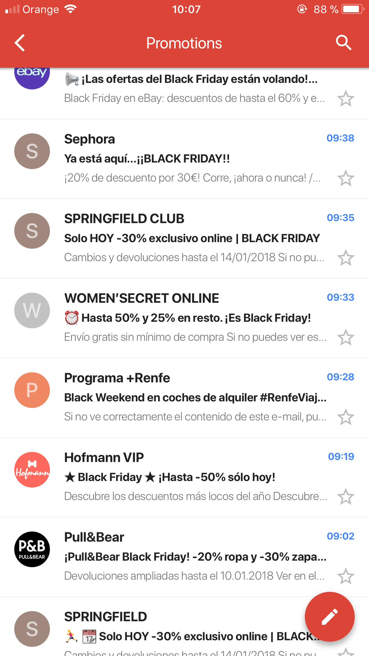 Este es mi buzón de entrada de e-mails, y con el boom de esta nueva moda, lo lleva siendo casi toda la semana. Como compradora que soy -a veces impulsiva- desde hace varios años he llegado a la conclusión de que algo así no puede ser sano. Me ha costado bastante darme cuenta del trasfondo que podemos encontrar en este tipo de publicidad engañosa y del juego que se traen entre manos las grandes firmas obligando a las pequeñas empresas a bajar sus precios sabiendo que estos no van a poder obtener ningún beneficio o casi ninguno; pero dada la actualidad que viven esas pequeñas empresas todavía se sienten obligadas a participar en una vorágine competitiva dominada por los más poderosos que provoca el deterioro de la esencia en los pequeños y cercanos establecimientos, además de promocionar una insensata fiebre consumista.